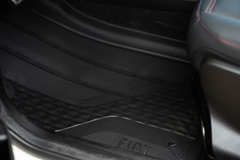O Tapete de borracha de bordas elevadas Fiat cobre toda a área e possui ranhuras para retenção de líquidos.