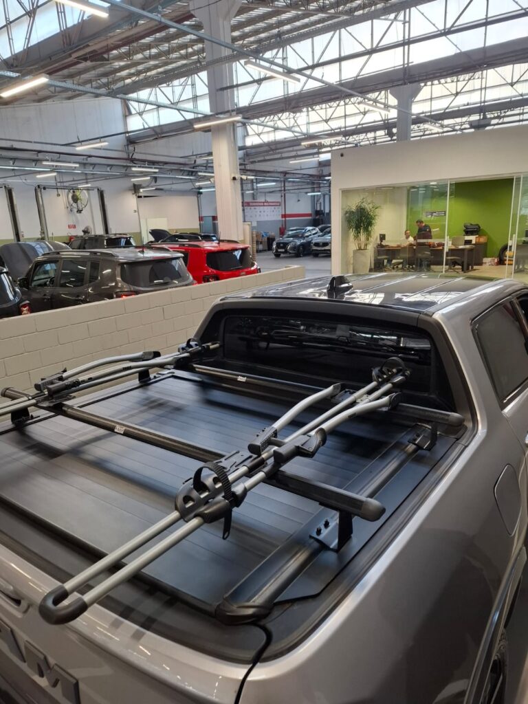 Lembrando que quando furado a borracha para colocação do suporte tanto no carro com a capota eletrica , quanto no carro sem capota eletrica que é furado na borda interna da caçamba para fixação das barras transversais , os furos ficam visíveis, caso haja necessidade de remover as barras transversais da caçamba.