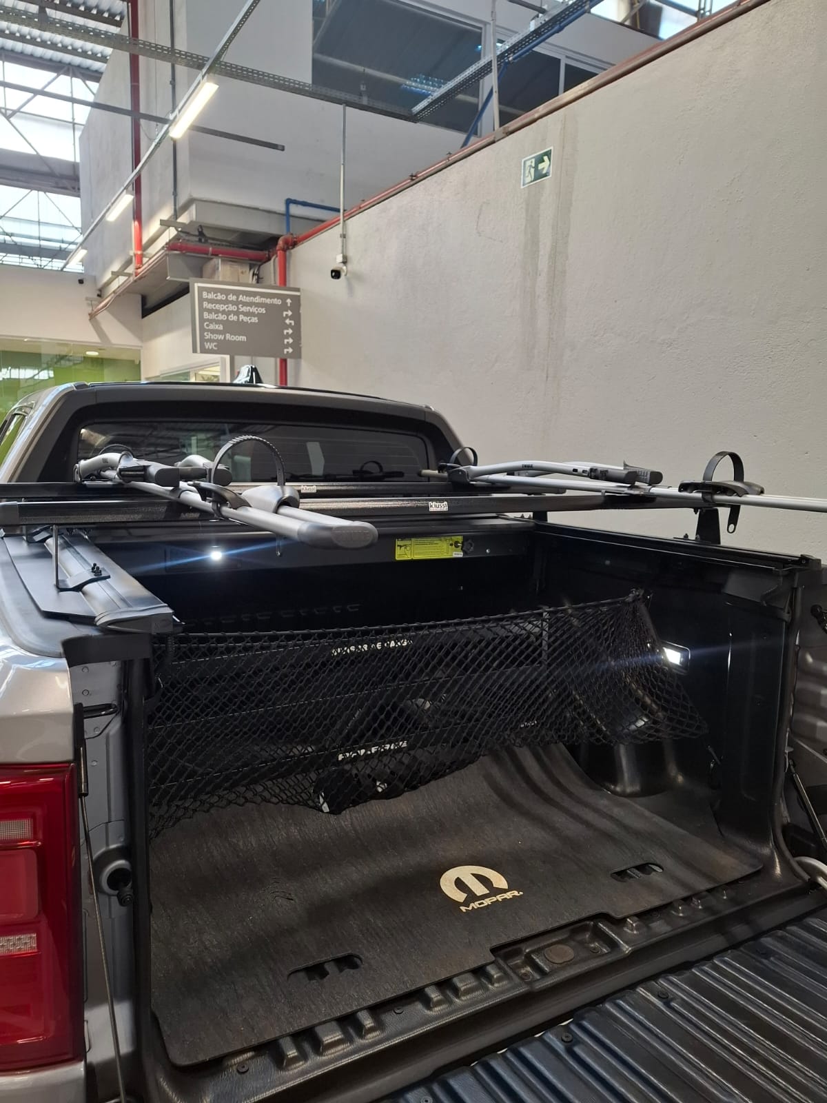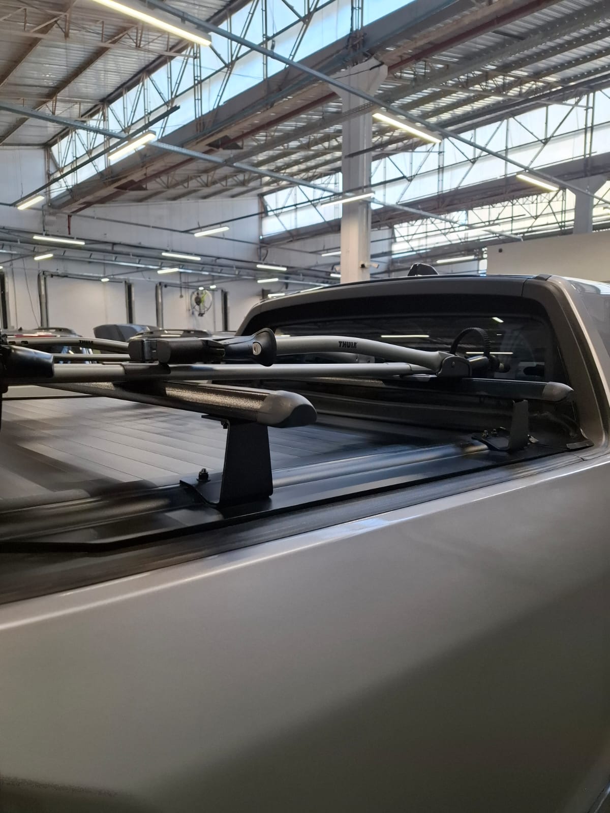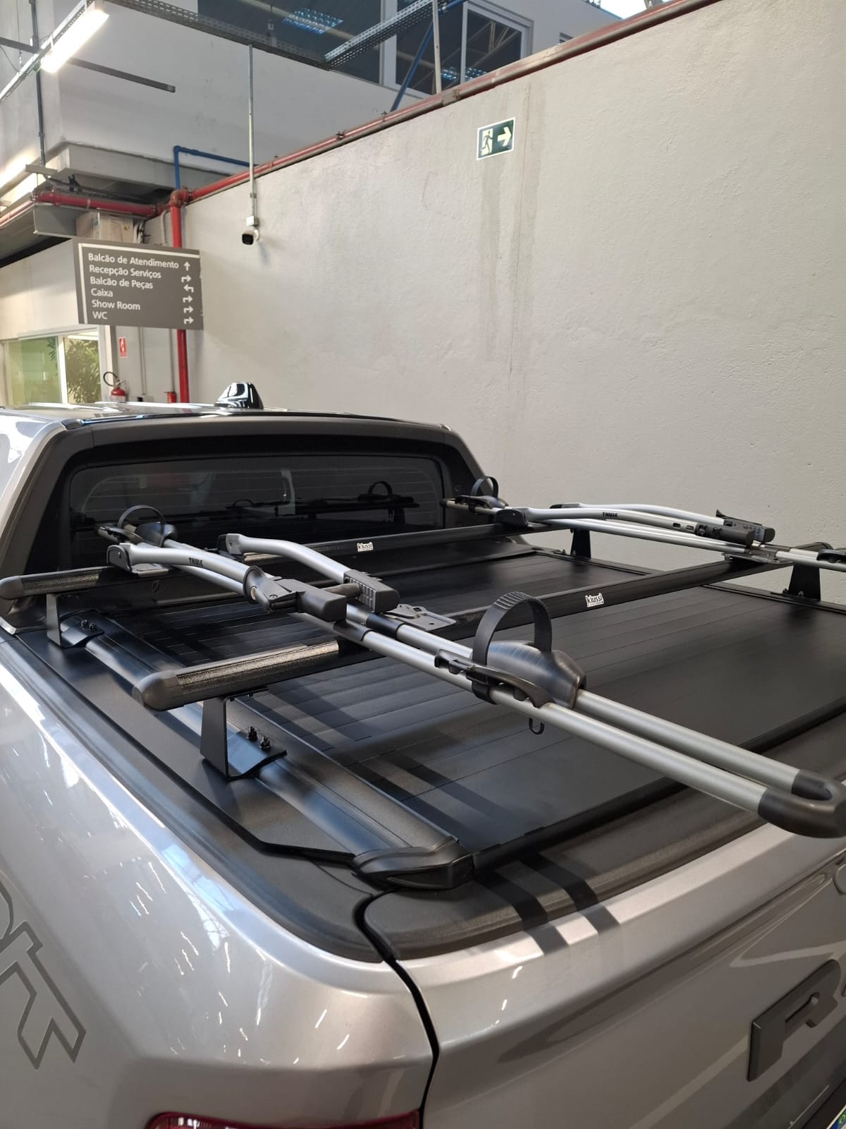 Lembrando que quando furado a borracha para colocação do suporte tanto no carro com a capota eletrica , quanto no carro sem capota eletrica que é furado na borda interna da caçamba para fixação das barras transversais , os furos ficam visíveis, caso haja necessidade de remover as barras transversais da caçamba.