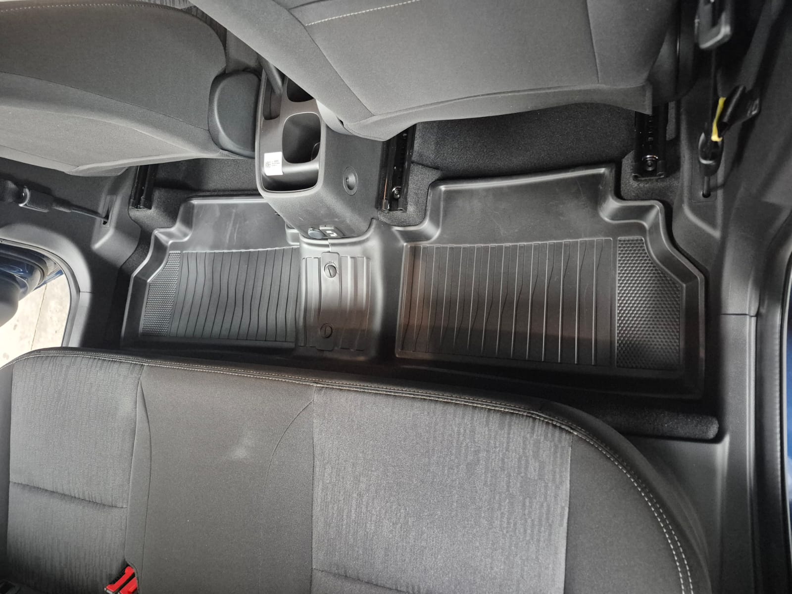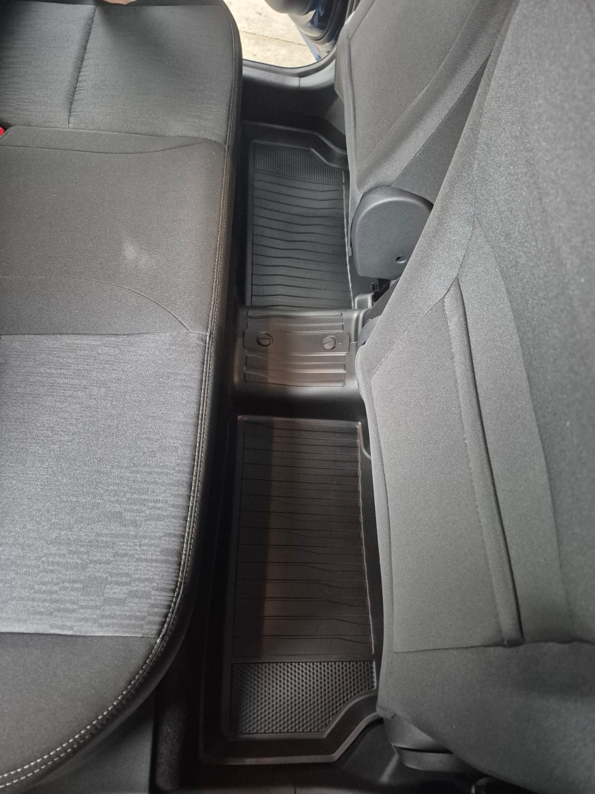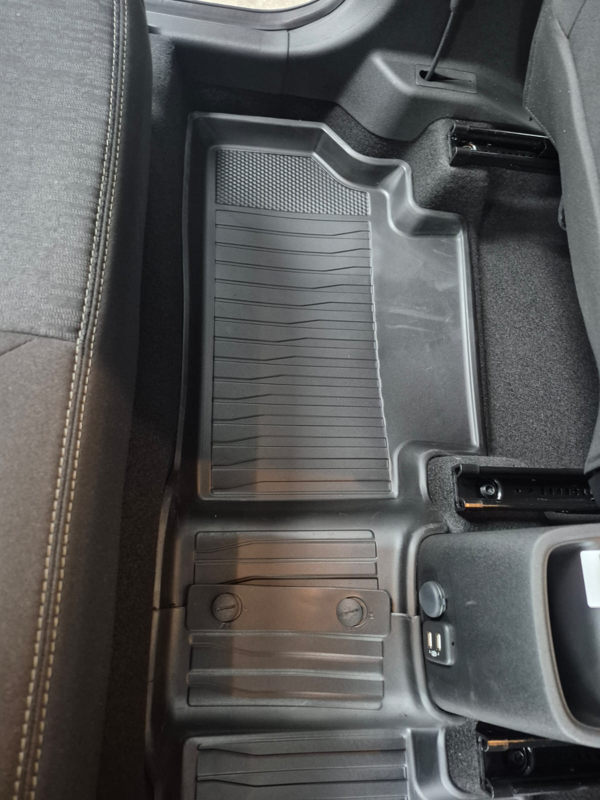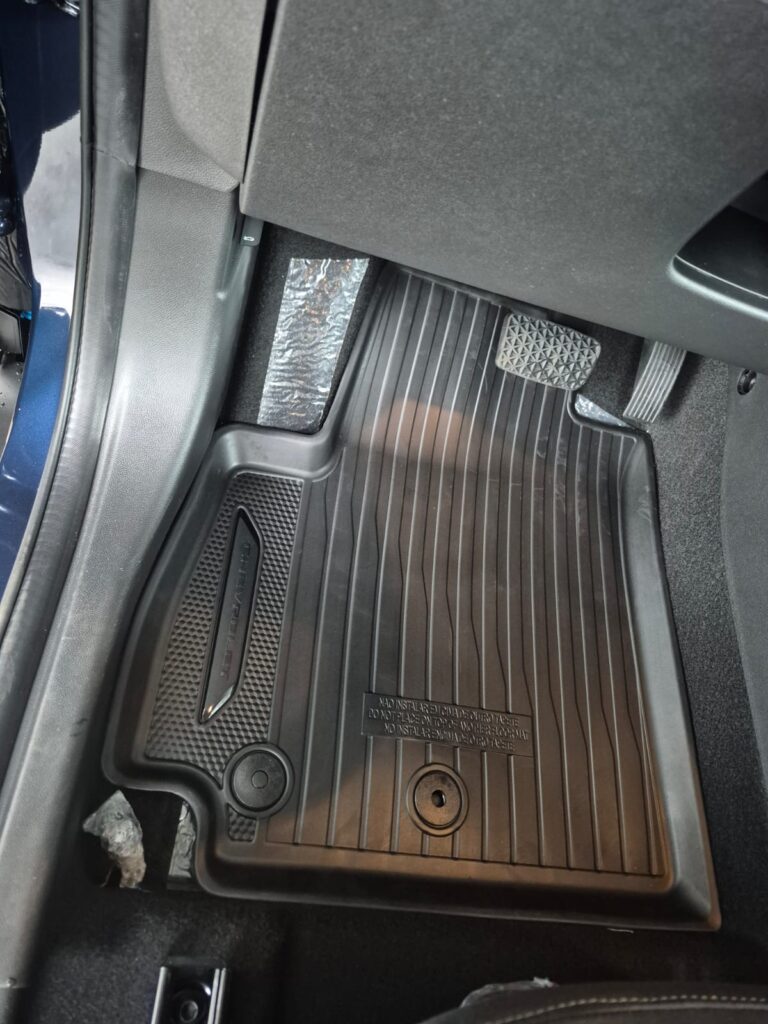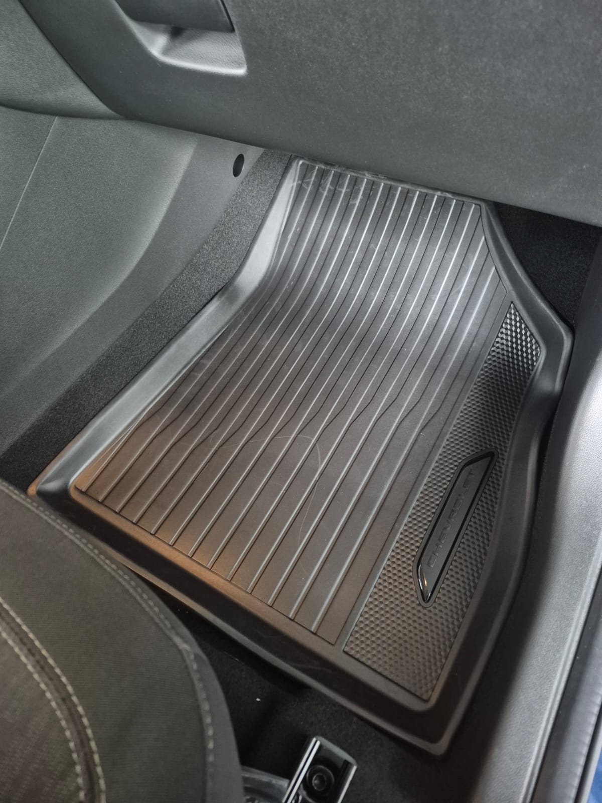 -O Tapete de borracha de bordas elevadas Chevrolet cobre toda a área e possui ranhuras para retenção de líquidos.